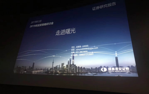 报告会开始由皮家银老师解读当前宏观经济运行状态,指出经济下滑的潜在风险,有些上市公司净利润增速也会有所下滑,中美贸易战最近只是暂时缓和,市场依然存在一些变数。针对当前政策支持科创板的推出,加上5g建设周期提速,解读目前券商和5g板块上涨过快的逻辑;当前快速上涨、游资炒作个股非常多,多数被炒作公司主营业务与概念毫无相关,经营业绩也很差,投资者追涨风险很大,投资者需要明辨形势,不要当游资的接盘侠。选股思路可以侧重机构偏爱的业绩增速稳健、连续几年持续盈利的公司。对业绩稳定的医药板块和防御板块的食品饮料也做了逻辑分享,同时提示医药行业“带量采购”的风险,食品饮料行业估值偏高风险。对一些选股比较迷茫的投资者,建议配置指数etf,避免踩雷,股票不好做时客户的大部分资金可以配置理财,分散风险,而不是什么时候都满仓炒股。