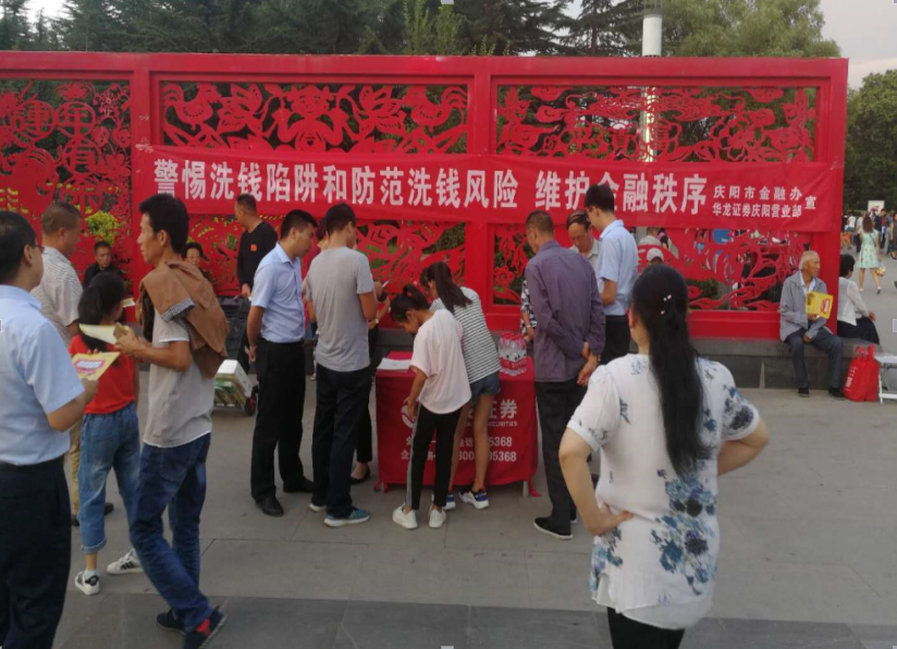 华龙证券庆阳营业部历来高度重视投资者教育工作,投资者教育和风险揭示工作是一项基础工作,也是一项长期的重点工作。我营业部于2018年8月8日至9月8日在西峰区东湖公园广场开展了为期一个月的“警惕洗钱陷阱和防范洗钱风险 维护金融秩序”主题宣传活动。围绕投资者关心关注的问题,利用我们的专业知识,扎实做好宣传工作,履行华龙证券庆阳营业部服务地方经济的社会责任。