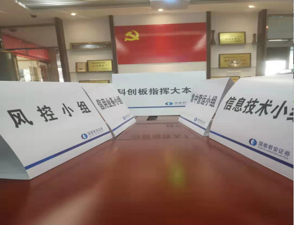 早上8点30,分公司科创板指挥大本营成员在分公司会议室准时集合,科创板指挥大本营由分公司总经理兰革儒统一领导,副总经理安定作为总指挥,大本营的主要成员包括分公司信息技术小组、集中营运小组、合规风控小组、信用业务小组,开盘前,安定总指挥各小组进行现场演练,各小组各负其责,联动和汇报机制均在9点前建立完毕。