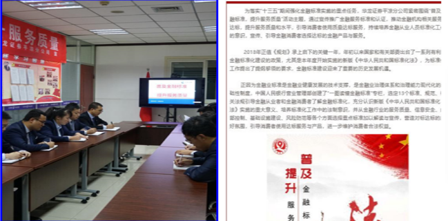分公司组织全体员工认真学习《标准化法》,并结合行业实际,参照《证券期货业信息系统审计指南》(jr/t0146-2016)等具体要求,明确行业标准规范,全面梳理制度、流程、风控体系,增强员工服务质量达标意识。同时,制作普及金融标准专题微信页面,配合深入浅出的图文讲解,累计阅读人数6000多人/次,引导广大群众了解金融标准,营造了良好的宣传氛围。