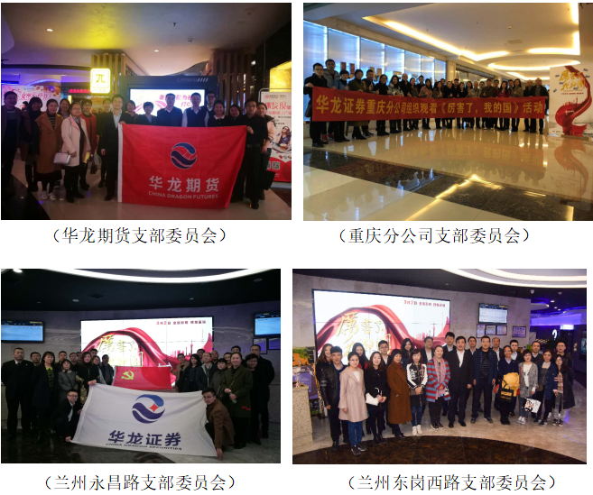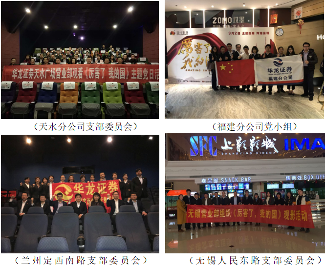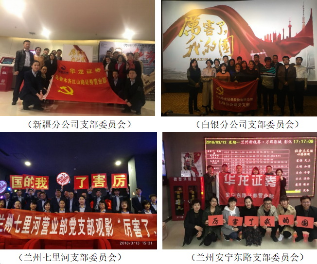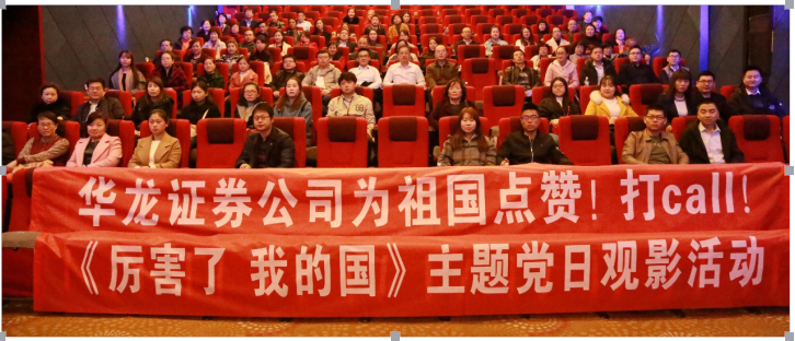 华龙证券股份有限公司党委根据公司“两学一做”学习教育制度和学习十九大精神系列活动计划,认真安排部署,积极组织全体党员、干部、员工开展《厉害了,我的国》主题党日观影活动,为每人购买2张影票,与家人朋友一同观影。不仅丰富公司学习活动内容,提高精神素养,感受新时代祖国翻天覆地变化,同时传递正能量,增强企业凝聚力,激发昂扬斗志,鼓舞全体人员朝气蓬勃迈向未来。