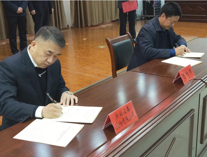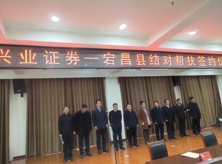 为了积极响应党中央、国务院关于“精准扶贫、精准脱贫”的基本方略,贯彻中国证监会、中国证券业协会关于“一司一县”结对帮扶行动的倡议,2019年1月14日,兴业证券与甘肃省宕昌县结对帮扶签约仪式在宕昌县昌兴大酒店隆重举行。甘肃省政府办公厅副主任刘全平,甘肃省政府办公厅保密委专职副主任兼帮扶办主任汪爱文,甘肃证监局副巡视员、甘肃省证券期货业协会、甘肃省上市公司协会常务副会长兼秘书长陈耔宏,甘肃省地方金融监管局三处处长潘秀,宕昌县人大常委会主任王仲华,县政协主席石如意,县委常委、常务副县长苏浩,副县长何玉柏等领导出席此次仪式。受公司总部委托,兴业证券甘肃分公司负责人徐建飞、财富管理部负责人赵军参加签约仪式。
