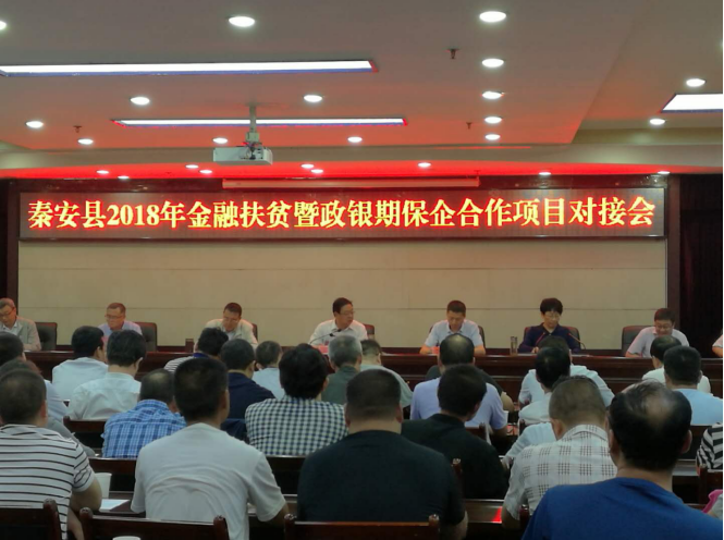 为深入贯彻落实中央关于金融扶贫的决策部署,充分发挥金融服务实体经济的作用,2018年7月9日下午3时,在秦安县行政中心会议室举行了关于金融扶贫暨政银保企合作项目对接会议。此次会议,秦安县政府邀请到各金融保险机构主要负责人,期货公司负责人以及相关企业及经济组织负责人,希望共同就金融扶贫的相关内容达成共识,并针对特定的扶贫项目合作达成协议。