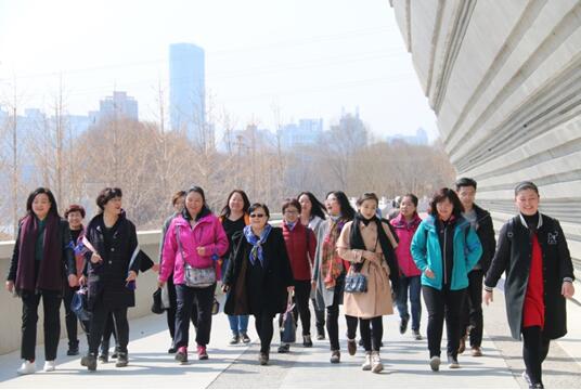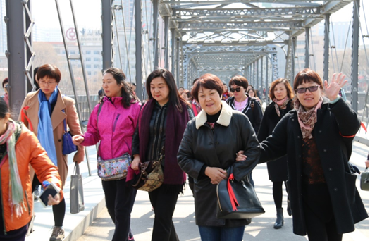 下午13:30分,参加活动的女士们络绎到达指定地点,分成五组,佩戴标志着组别的各色丝带,穿过栉风沐雨百年的中山铁桥,沿北滨河路徒步向城市规划馆进发,开始了第一个环节“健步走”。