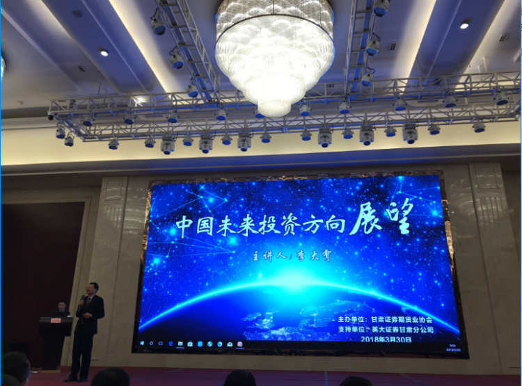 上午9时,容纳400人的会场内座无虚席。甘肃证券期货业协会常务副会长兼秘书长陈耔宏女士向与会嘉宾及投资者致欢迎词,并由国内知名的行业专家英大证券首席经济学家李大霄先生做关于“中国未来投资方向展望”的主题报告。