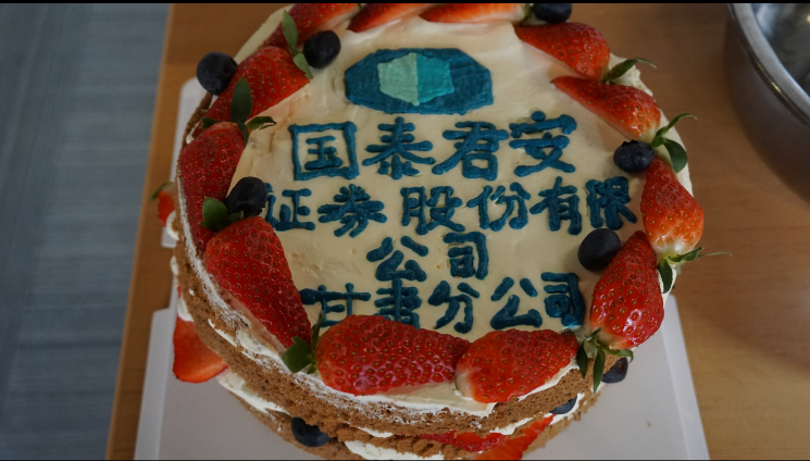 活动中我们分成三人一组进行,二十四个桌台,二十四枚蛋糕整齐排列。伙伴们在听完“水果裸蛋糕”的制作过程和注意事项后,穿上了围裙、口罩、带上了厨师帽,变身“西点师”开始体验。每个小组各有分工,取水果、挤奶油、装裱蛋糕井然有序,活动如火如荼进行着。伙伴们都充分发挥着自己的想象力,用水果绘制出脑海中最美的图案,随后漂亮的蛋糕也一枚枚呈现了出来。活动邀请我们国泰君安证券甘肃分公司总经理兰革儒总及总经理助理张晶总为大家共同评选出两枚最精致蛋糕的制作者颁发了活动纪念品,相机也将这一幕幕甜蜜瞬间记录了下来,最后活动在欢声笑语中落下了帷幕。