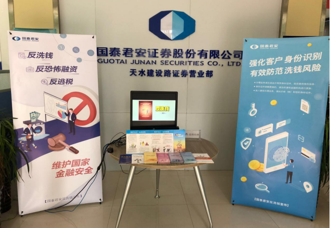为推动反洗钱工作有效开展,预防和打击洗钱犯罪活动,提高社会群众、投资者反洗钱意识,营造良好的反洗钱社会环境,国泰君安天水营业部按照2018年全省反洗钱宣传月工作通知要求开展了一系列的主题户外宣传活动,为保证本次宣传活动达到预期的效果,营业部工作组提前订制反洗钱宣传横幅,并搜集相关宣传折页、手册。在2018年9月一整月中,营业部全体员工在完成自身的工作之余积极响应号召全面参与反洗钱宣传工作,将“国泰君安共识”体现在现实工作中,充分诠释了国泰君安的社会责任与价值。营业部也高度重视员工共识思想教育,公司核心价值观时刻牢记于每一位员工心中。我们以恪守责任为修身之本,秉承忠于职守、勤勉尽责,安排员工整理反洗钱最新实用指南、案例精选等相关资料,做好充分的准备工作。
