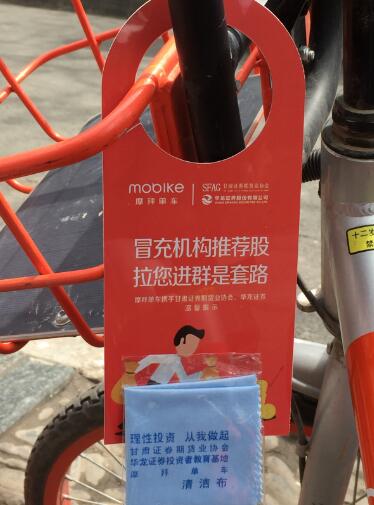 4月25日,1万辆身挂小红牌的摩拜单车出现在甘肃省会兰州街头。甘肃证券期货协会、华龙证券投资者教育基地携手摩拜单车创新投教新形式,小红牌上印有各种言简意赅的宣传用语,如“产品介绍要看清 谨防误导和误听”、“冒充机构推荐股 拉您进群是套路 ”、“巨额收益是假象 高息骗钱是本质”、“一夜暴富是幻想 忽视风险易受伤”、“庞氏骗局不复杂 离谱收益常夸大”等,真正将投教活动做得生动活泼、与时俱进,随处可见、随时可见。