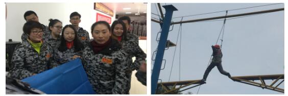 全员换上了整齐的迷彩服后,集合列队飒爽挺拔。进行了富有激情的开营仪式,随后便是一天紧锣密鼓,充实而又不乏趣味的拓展训练内容。一开始的项目游戏意味还较浓,但随着时间的推进,项目也逐渐变得注重团队配合并且富于智力和毅力的挑战。在“呼吸管理”环节中要有严密的组织分工和精准的指挥命令才能快速正确的搭建好“呼吸构架平台”。还需要整个团队的无暇配合才能在短时间内连续吹爆十个气球。“神笔马良”环节更是将团队配合分工与精细操作的重要性诠释的淋漓尽致。“高空断桥”不但挑战个人的勇气和毅力,也让人明白了,面对困难时身后一个为自己鼓气并且提供支持与安全保护的团队便可以激发个人潜能完成困难的任务目标。