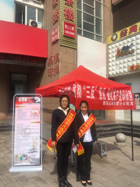 为了活动顺利开展,甘肃分公司提前做好了计划安排,工作人员身着工作服,佩戴印有“西南证券反洗钱宣传”的绶带,架起活动支架,悬挂宣传横幅,摆放《反洗钱小贴士》、《学习“三反”常识,配合身份识别》、《甘肃省恐怖融资防范手册》、《预防洗钱,维护金融安全》、《反洗钱最新案例精选》《反洗钱实用指南》等宣传手册和折页。