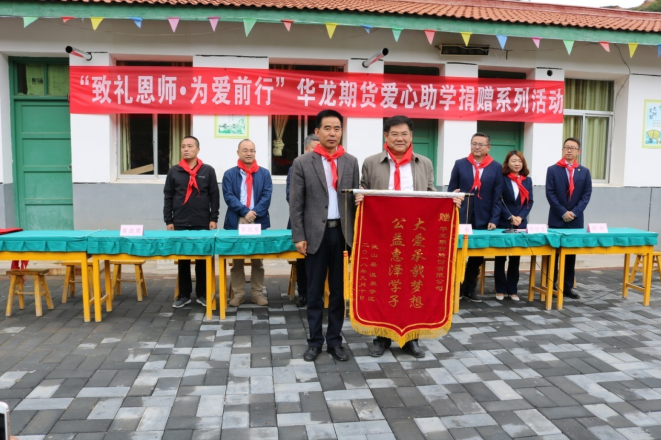 随后华龙期货董事长娄德全和武山县副县长马维杰向两所学校捐赠物资,并向温泉镇全体教师赠送教师节礼物。温泉镇学区书记代表两所学校和全镇教师向华龙期货赠送锦旗表示感谢。此次爱心捐赠活动,让学生和老师们感受到社会的关爱和温暖,传递出华龙人的爱心和正能量。