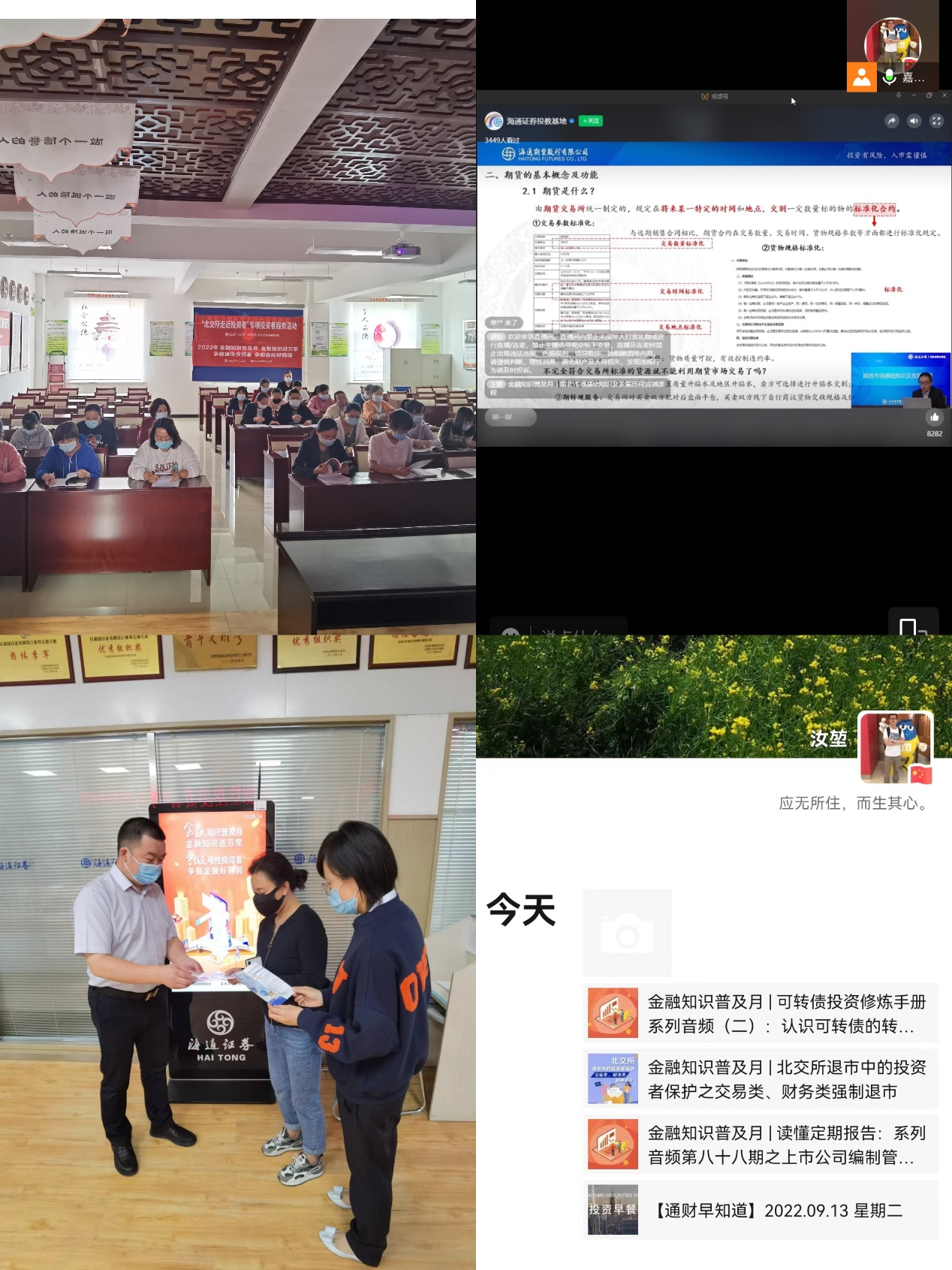 营业部运用线上线下联动,不断扩大影响力。线下,9月23日,营业部组织金融宣传月进社区活动,以金融知识、防范非法活动为核心,进行宣讲、各类册页资料的发放等,有效提升社区居民的金融知识,履行了社会责任;线上,为提升群众关注度,加深内容理解,营业部从多角度入手,打造了众多创新宣教内容,有效调动投资者的学习热情及积极性。利用腾讯会议进行线上转播公司投教直播视频;利用员工微信朋友圈不断转发金融宣传月宣讲内容,不断强化员工和投资者对专业知识了解和防范金融诈骗、非法活动的警惕。