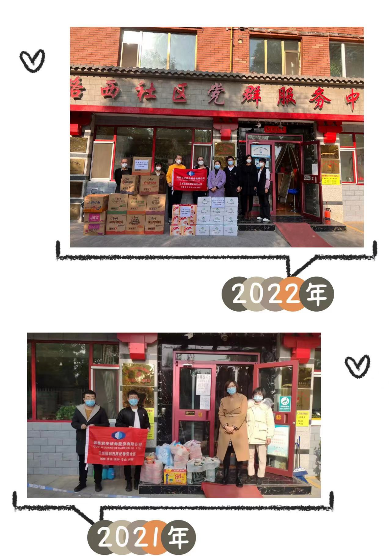疫情反复,在去年的11月停工停产期间,营业部也为公园路社区送去了物资,共同抗疫。一年过去了,我们依然坚守岗位,肩负起金融报国的社会责任,积极倡导全体员工以各种方式参与疫情防控工作,以实际行动彰显担当,展现作为,助力打赢疫情防控阻击战!