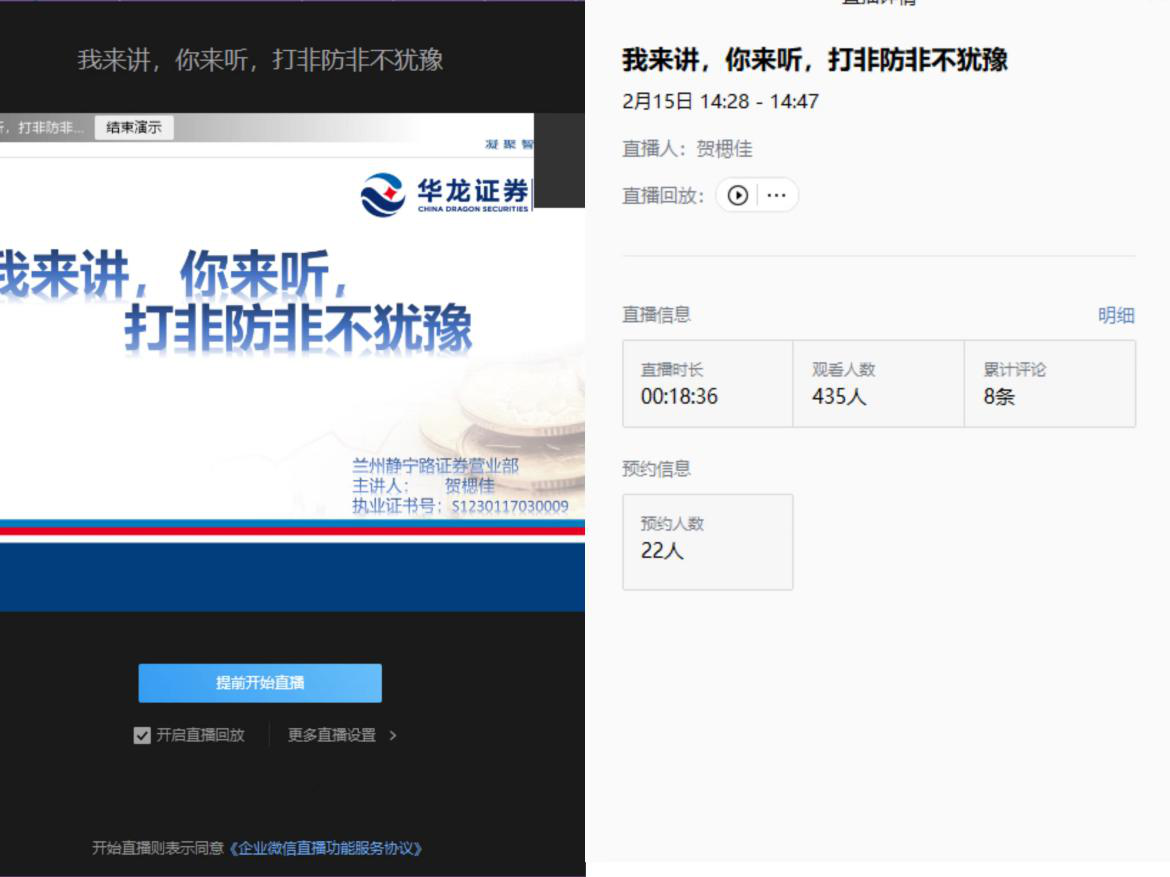 为贯彻落实《防范和处置非法集资条例》,按照甘肃证监局、甘肃证券期货业协会及公司有关安排部署,进一步保护投资者合法权益,远离非法证券活动,提高投资者对非法证券活动的识别能力及防范意识,华龙证券兰州静宁路营业部在华龙证券投教基地指导下于2023年2月15日组织开展了“我来讲,你来听,打非防非不犹豫”专题直播活动,本次活动共有435名投资者参与,使投资者对非法证券活动的特点、维权方式等方面加深了了解,得到了投资者的好评。