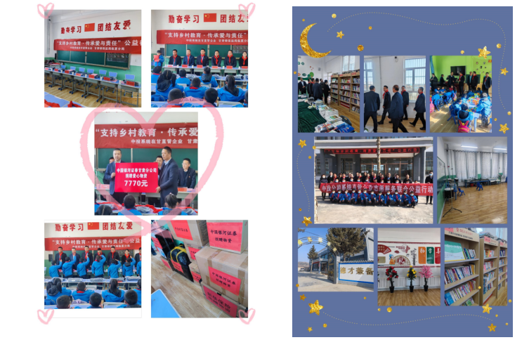 为进一步落实中投公司系统直管企业民生保障工作部署,更好地服务国家战略、支持民生保障、履行国企担当。中国银河证券甘肃分公司工会牵头积极响应倡议,参加了“中投直管在甘企业开展联合公益行动”活动,组织全辖员工为临夏州和政县松鸣镇狼土泉小学的孩子们捐款捐物合计价值7770元,为孩子们购买了书包、体育用品、文具、地球仪、棋类益智游戏用品等,员工还捐赠多种课外读物供孩子们阅读。