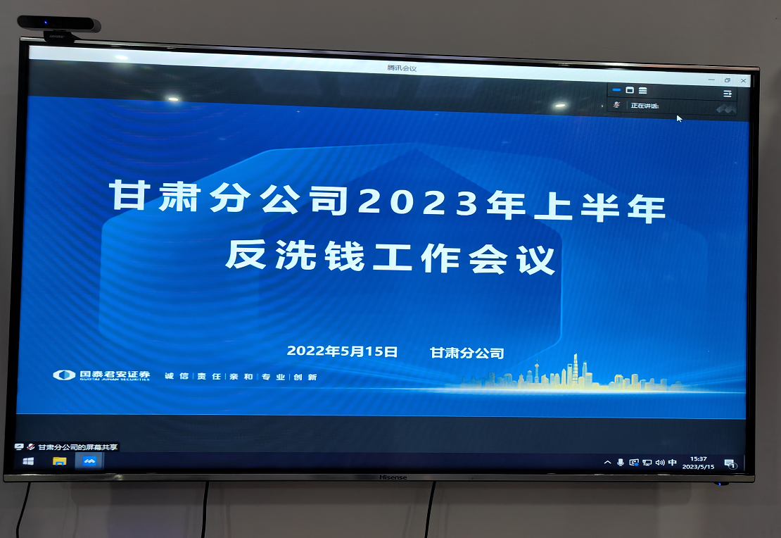 5月15日,国泰君安证券甘肃分公司为传达2023年人民银行反洗钱工作会议精神,落实《2023年全省反洗钱工作安排》,推动反洗钱工作质效,召开2023年上半年反洗钱工作会议。国泰君安证券张掖县府南街营业部全体员工通过线上参会。