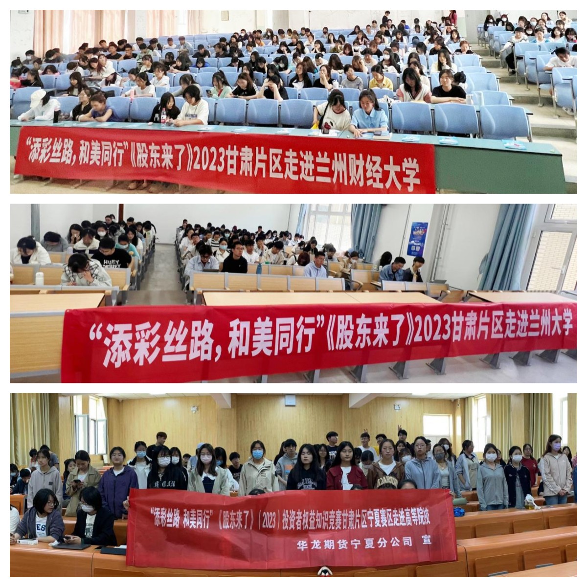 5月中旬,为进一步提升在校大学生的金融素养和金融知识水平,助力推进投资者教育纳入国民教育体系,华龙期货总部、华龙期货宁夏分公司,组织开展了“添彩丝路,和美同行”《股东来了》(2023)走进高校系列主题活动。期间分别在兰州大学、兰州财经大学、宁夏理工学院等多所高校开展了现场宣讲活动,为学生普及金融知识,远离各类金融违法违规陷阱。活动通过视频展播、现场知识讲解、投教知识问答等多种形式,有效引导学生为未来职业发展规划、学术研究方向打开新思路。