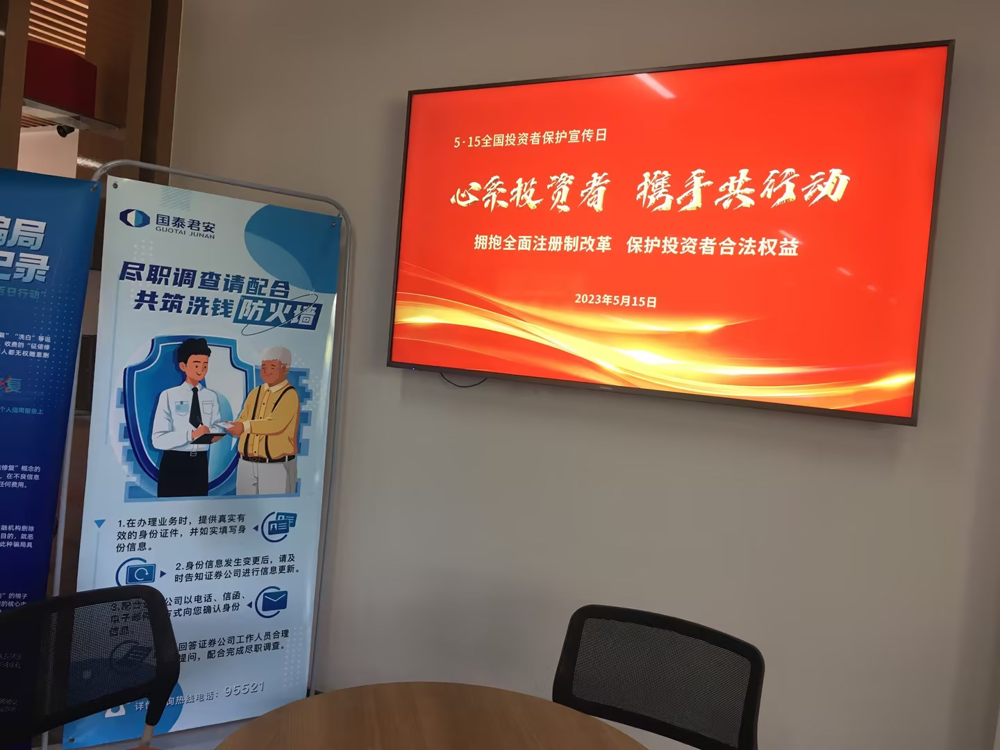 为做好全面实行股票发行注册制投资者保护工作,维护广大投资者合法权益,国泰君安证券酒泉南大街营业部积极响应工作部署,组织开展第五届“5·15全国投资者保护宣传日”活动。