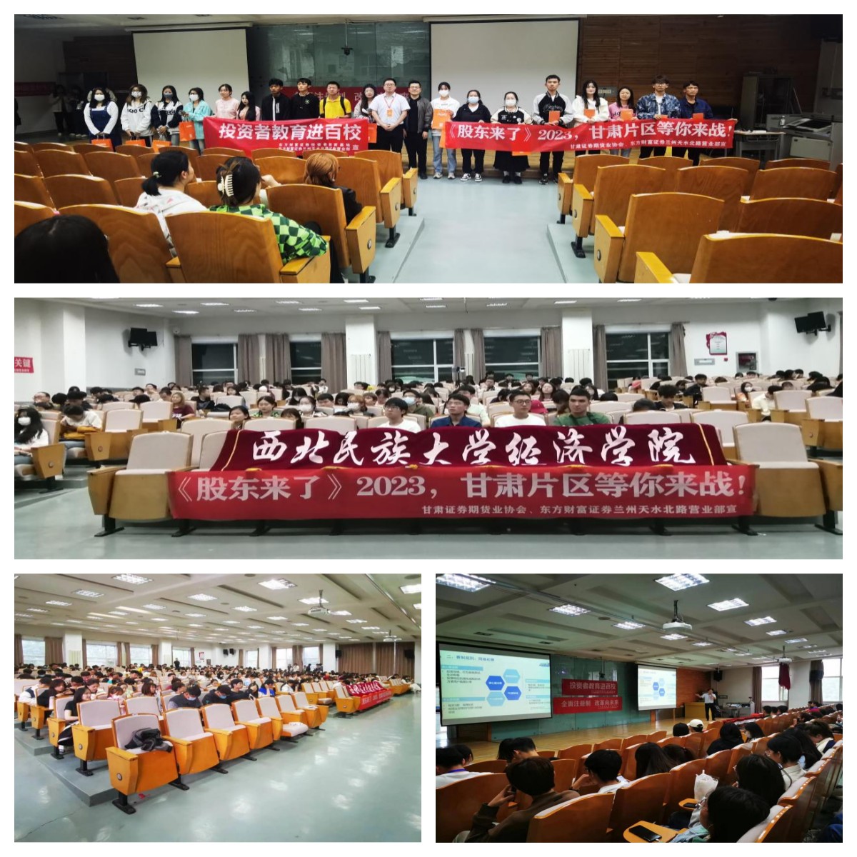 《股东来了》(2023)投资者权益知识竞赛于5月15日正式开赛,为加大活动宣传力度,进一步加强在校大学生金融知识普及教育,也为了积极响应甘肃片区“添彩丝路,和美同行”主题活动的号召,5月26日,由东方财富证券投教基地联合西北民族大学主办,兰州天水北路营业部承办了主题为“学股票基础知识 识多种投资方式”的《股东来了》(2023)进校园活动。