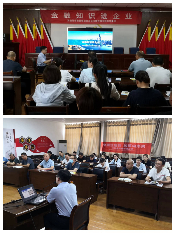 海通证券金昌营业部于2023年7月14日走进内蒙古雅布赖盐化集团,向集团总部全体职工开展“金融知识进企业”及“全面注册制 改革向未来”等系列投教活动,当天参加活动的人员约40多人。