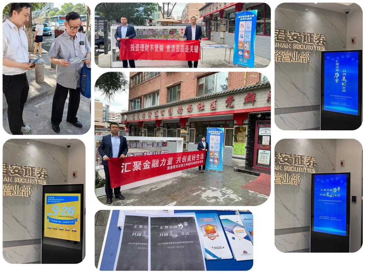 国泰君安证券兰州福利西路营业部于9月26日特举办以“汇聚金融力量 共创美好生活”为主题的金融消费者权益保护集中教育宣传活动,包括金融知识进社区及场内举办的线下客户活动,目的在于提升消费者金融素养,增强金融安全意识,促进市场公平有序,普及金融知识、传播金融正能量,防范非法金融活动、树立价值投资观念。