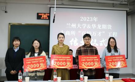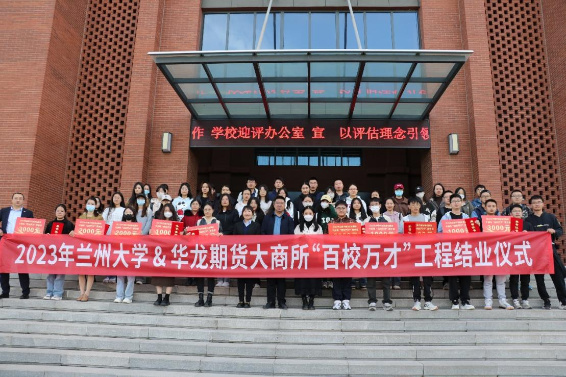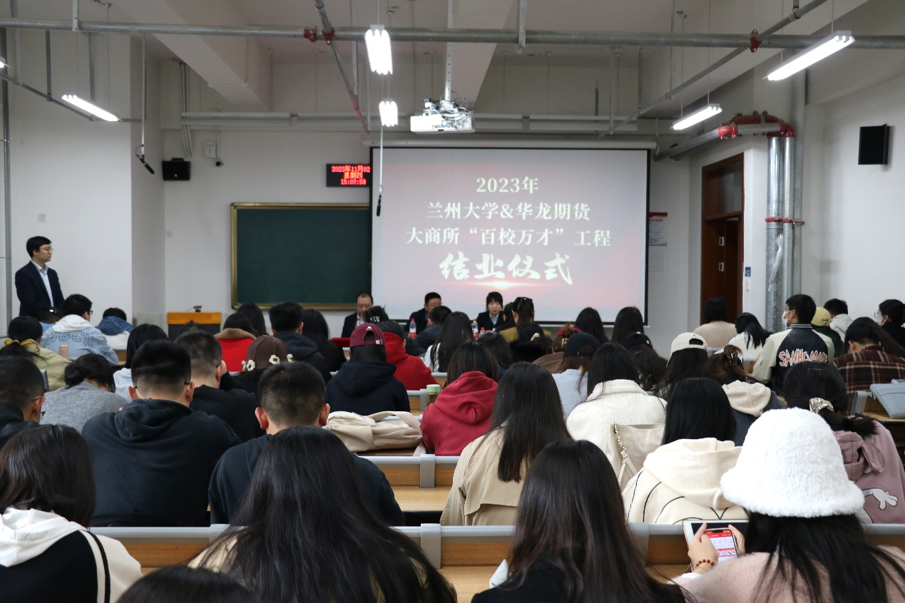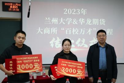2023年11月2日下午,由大连商品交易所支持,华龙期货和兰州大学联合举办的2023年度“百校万才”工程结业仪式在兰州大学榆中校区秦岭堂隆重举行。兰州大学经济学院副院长潘永昕、华龙期货总经理助理胡佳艺、华龙期货兰州营销中心总经理张鑫出席结业仪式,并为成绩优秀的同学颁发“百校万才”项目奖学金,兰州大学经济学院2022级专硕学生参加本次仪式。