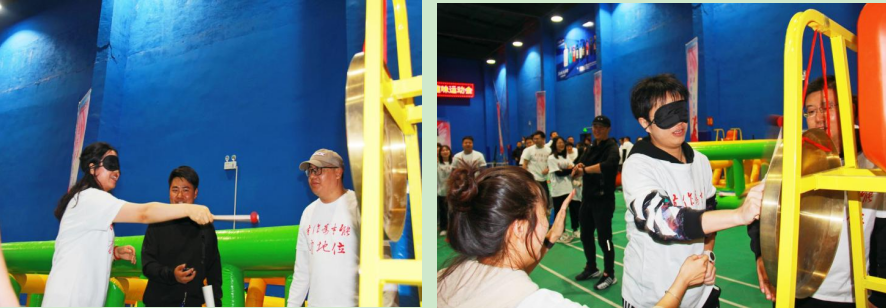 紧接着是“蒙眼敲锣”每组的员工们排成一队,传递着锣棒。比赛过程中,大家互相鼓励、互相支持,展现出了团队协作的力量,最后,速度与激情交织在一起,为观众带来了一场精彩的视觉盛宴。