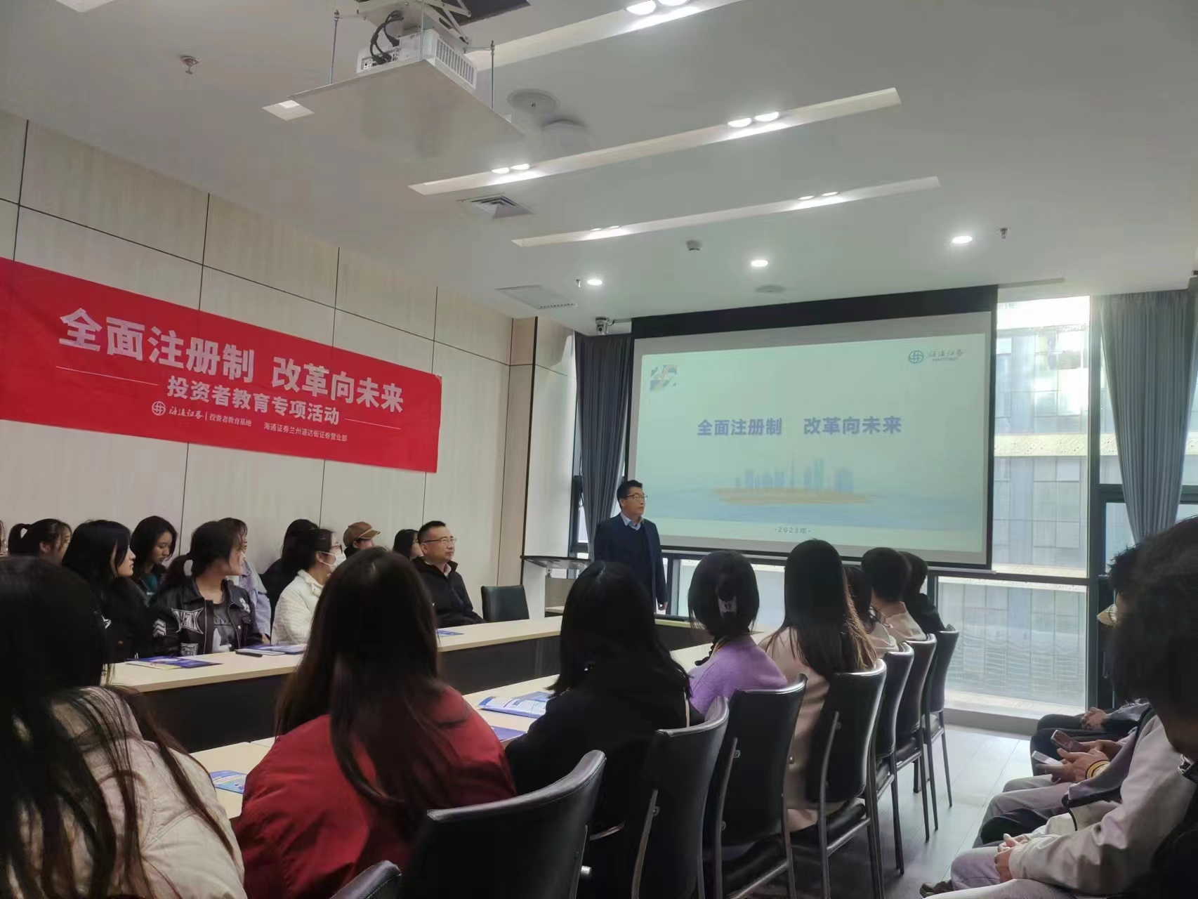 本次活动结合“投教走进营业部”主题,面向甘肃农大经济学院学生,以全面注册制解读为主旨开展,讲座主要从注册制基本制度发展历程、注册制交易规则、注册制重要意义及影响以及风险揭示等几个方面展开,详细深入的向高校师生阐述了全面注册制相关业务知识,同时,现场向在座师生发放注册制宣传彩页80余份,针对师生关心的金融热点问题、就业导向等问题进行了现场互动。