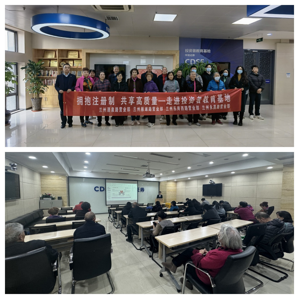 11月22,营业部联合雁滩路营业部、永昌路营业部以及酒泉路营业部开展了“投资者走进投教基地”活动,活动伊始,投教基地工作人员对投资者的到来表示热烈欢迎,并带领投资者参观了投教基地,期间讲师从国家投保政策、证券市场发展历程、华龙证券实体投教基地概况、华龙证券互联网投教基地概况及投教产品五个方面为投资者进行了讲解,现场气氛热烈。