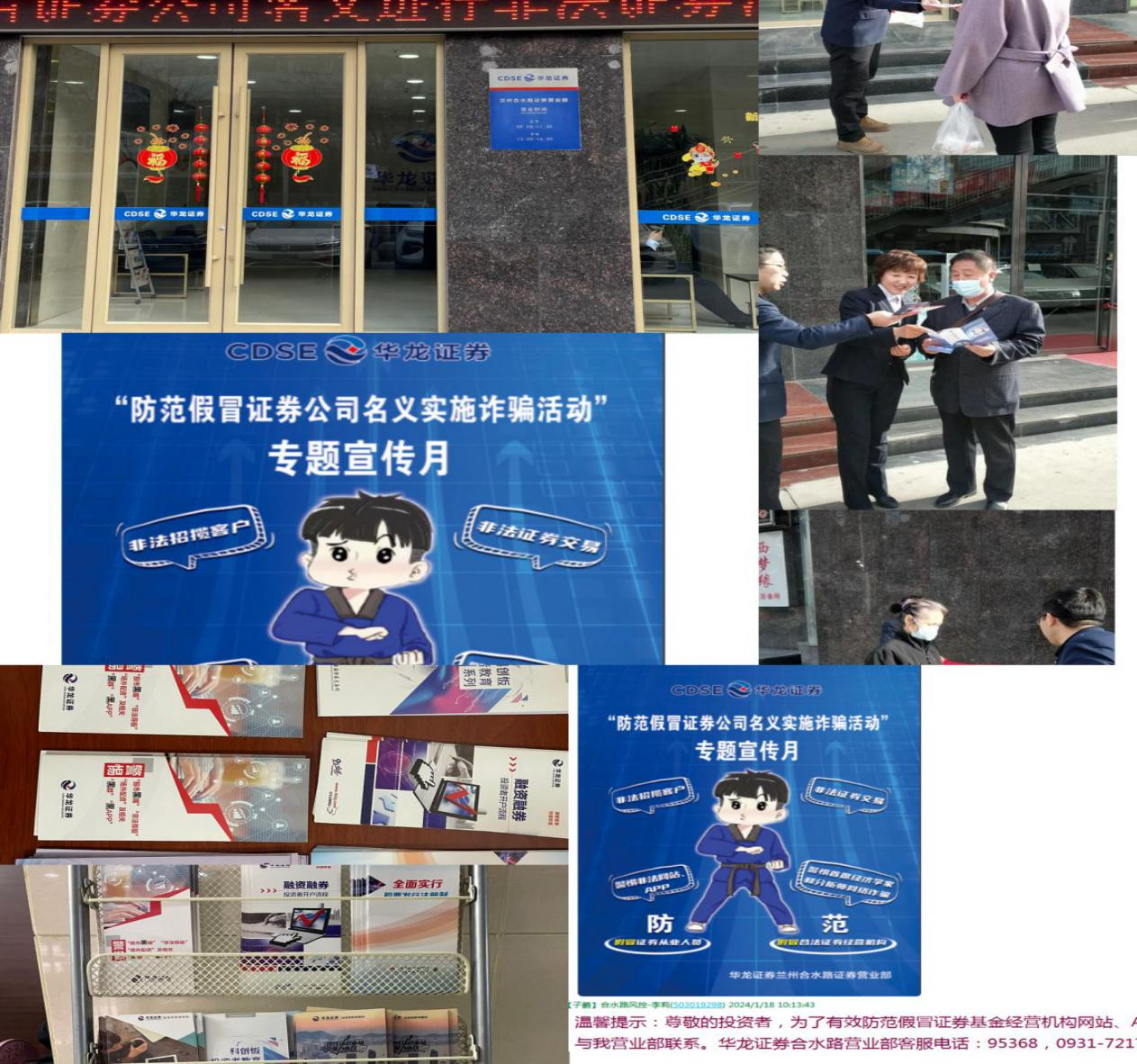 为切实保护人民群众财产安全,进一步做好防范假冒证券公司名义实施诈骗活动宣传工作、投资者保护相关知识宣传工作。华龙证券兰州合水路营业部在接到通知后第一时间成立工作小组,营业部负责人为组长,各部门负责人为组员,一旦发生网络诈骗事件,假冒事件应对工作小组立即启动应急处理机制,协助受害者报警,并配合公安机关及时处置涉嫌诈骗的账号,尽力防止损失。 同时,通过投诉对接渠道,协调发布平台切断非法信息传播链条,及时向公司反馈,承担向公众澄清事实的职责与义务。