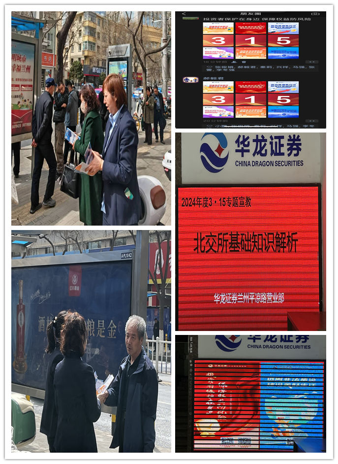 3月15日,营业部电子屏统一滚动播放权益保护日主题宣教图片和金融知识宣传资料,悬挂宣传横幅,营业部微信公众号推送“投资者保护在身边 保障权益防风险”宣教电子画册及主题宣传口号内容,营业部员工走向现场客户,分发北交所新三板基础知识画册、适当性管理彩页、投资者权益保护图册等宣教材料,提示防范非法证券活动、坚持知识更新、了解市场变化,交流非法证券危害案例和维权方式渠道,营造良好积极的3·15主题日宣教氛围。同时,营业部组织员工走进附近商圈、商户、街区开展宣教活动,进一步普及金融知识、警示欺诈陷阱、分享投资理念及北交所基础知识、新三板知识解析、适当性管理、非法证券活动案例解析等,包含注册制改革、新三板、北交所、反洗钱防范、防范假冒证券公司名义实施诈骗活动等主题,帮助投资者树立风险防范与维权保护意识,营业部以警示词条、案例解析等为基础,提示投资者认清合法机构,使用公司官方交易软件,牢记正确的执业资质查询渠道和方式,提高风险识别能力,远离欺诈陷阱。