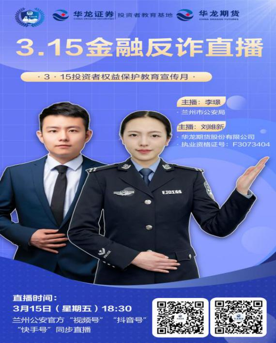 春日昂扬,风和日丽,第42个3·15国际消费者权益日如期而至。3月15日,投教基地携手兰州市公安局、华龙期货开展了3·15金融反诈直播活动,更大范围的将防非反诈等相关知识辐射到了多领域,本次直播兰州公安、华龙证券、华龙期货各平台观看总人数为8395人次,直播效果显著。