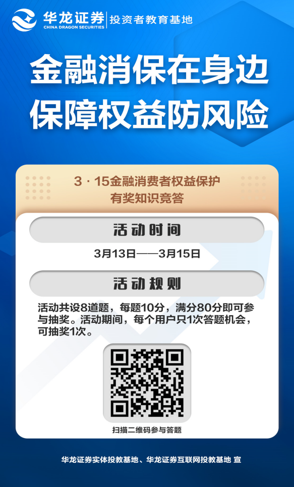 坚持以人民为中心的价值取向,以提升投资者金融素养和金融安全意识、增强依法维权意识和能力为目的,宣导证券政策法规,提示投资风险,倡导理性投资理念。自活动开始以来,华龙证券积极响应,截至3月22日,公司投教基地、分支机构举办3·15投资者保护教育专项活动130场;原创制作投教产品46种,发放原创实物投教产品3500余份;同时,通过公司九州av官网、互联网投教基地、华龙点金app、公众号等渠道开展3·15专项活动宣传,覆盖超过5.6万余人次。