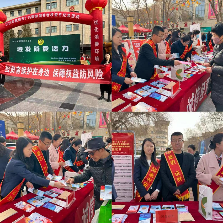 为积极践行金融机构社会责任、主动加大防范非法集资宣传教育工作力度,帮助社会公众树立风险防范意识、识别非法集资活动并自觉远离,2024年3月15日,国泰君安证券党河东路营业部组织员工在敦煌市市政广场配合市各单位及金融机构共同开展“2024年敦煌市3·15国际消费者权益日纪念活动”。