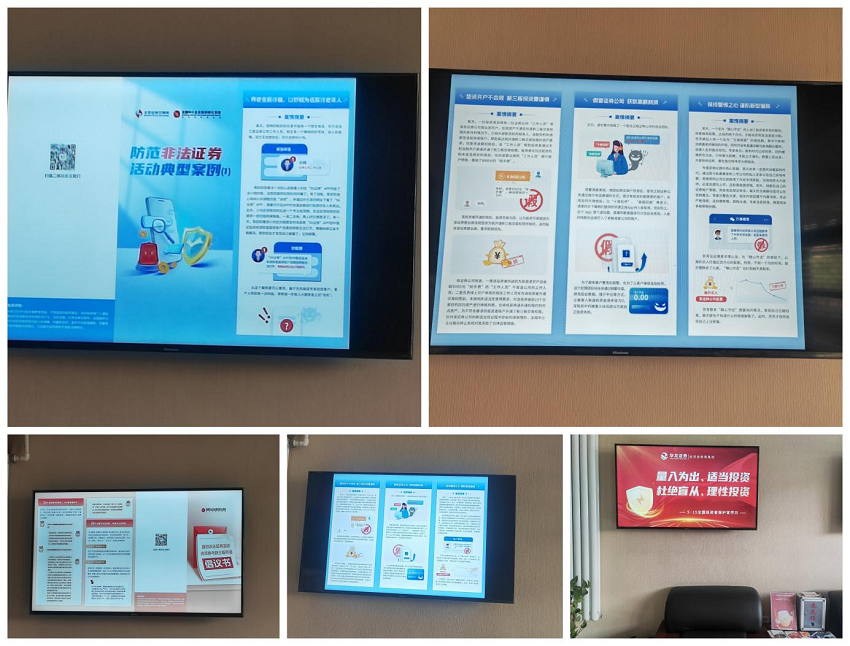 二、通过营业部电视屏、企业微信客户群、员工微信朋友圈等互联网线上平台,向投资者和广大群众转发协会及公司制作的“防非打非、5.15投资者权益保护等多种宣传海报和长图,转发和播放了“北交所的防范非法证券活动典型案例”、甄别非法证券活动,合规参与新三板市场倡议书、黑嘴“专家”莫轻信、投资分析要理性等很多宣传词条、5.15防非宣传月系列等很多内容,持续提示市场风险,扩大了本次宣传的覆盖面。