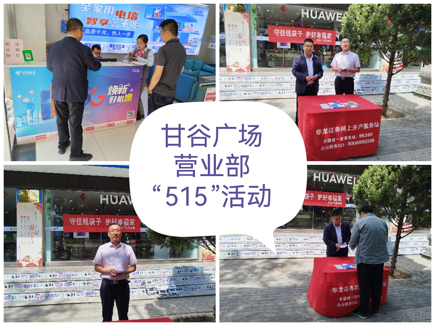 为进一步做好投资者合法权益保护工作,持续提高中小投资者的专业知识水平和风险防范意识,在“5.15全国投资者保护宣传日”来临之际,华龙证券甘谷广场营业部落实中国证券业协会、甘肃证券期货业协会及公司相关工作安排,积极有序地组织开展了以"守护钱袋子 保好幸福家”为主题的投资者教育专项活动。