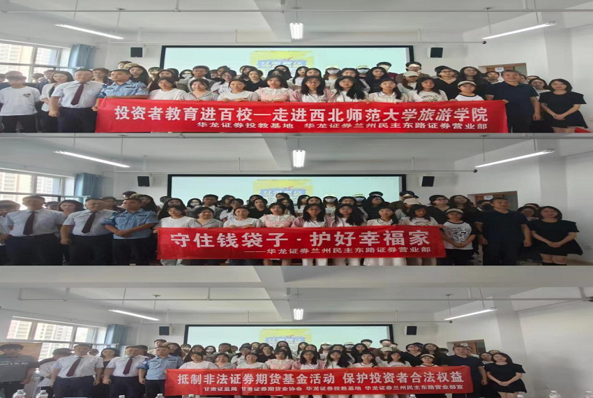 为积极响应中国证监会、中国证券业协会“推动投资者教育纳入国民教育体系”的号召,积极承担社会责任,充分发挥证券金融机构在提升国民金融素养工作中的主体作用,贯彻落实投资者保护工作,华龙证券兰州民主东路营业部开展了以“防范非法集资,远离金融诈骗”为主题的“投资者教育进百校”活动。西北师范大学旅游学院110余名师生参加本次活动。