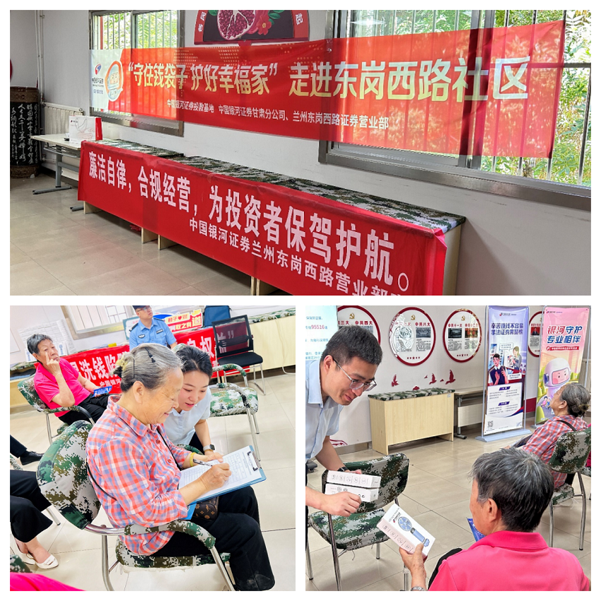 为了普及金融知识,增强居民的投资理财意识,中国银河证券兰州东岗西路证券营业部于2024年6月25日成功举办了“守住钱袋子,护好幸福家”走进东岗西路社区活动。本次活动重点围绕普及金融知识、风险揭示、防范诈骗、防范非法集资等,提高老年人防诈意识,做好投资者合法权益保护工作等展开投教宣传活动。旨在做好投资者合法权益保护工作,持续提高老年人风险防范意识,提供专业的金融咨询和服务。