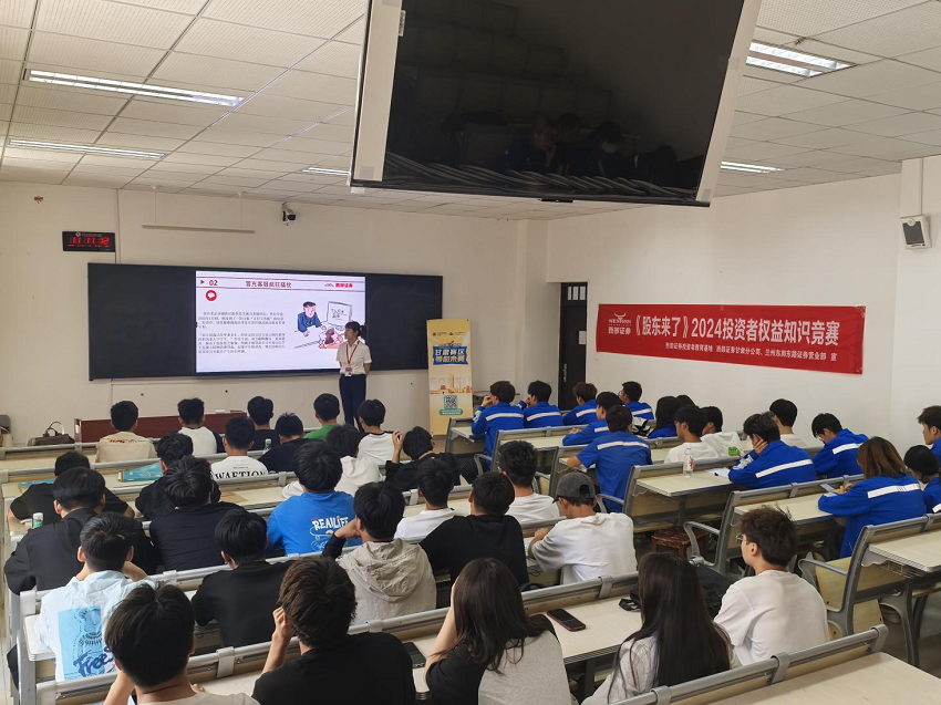 为认真贯彻落实《防范和处置非法集资条例》相关要求及投资者教育纳入国民教育工作,提升学生群体防范非法证券活动识别能力及防范意识,本着保护社会公众及投资者合法权益,远离非法集资活动,加强风险预警提示目的,西部证券甘肃分公司及兰州东岗东路营业部投资者教育小组走进兰州石化职业技术大学进行宣传,以课件的形式为同学们普及防范非法集资、校园贷相关内容及金融诈骗案例等,提示同学们加强金融风险防范意识。同时,推广《股东来了》(2024)投资者权益知识竞赛,现场与同学们积极互动。