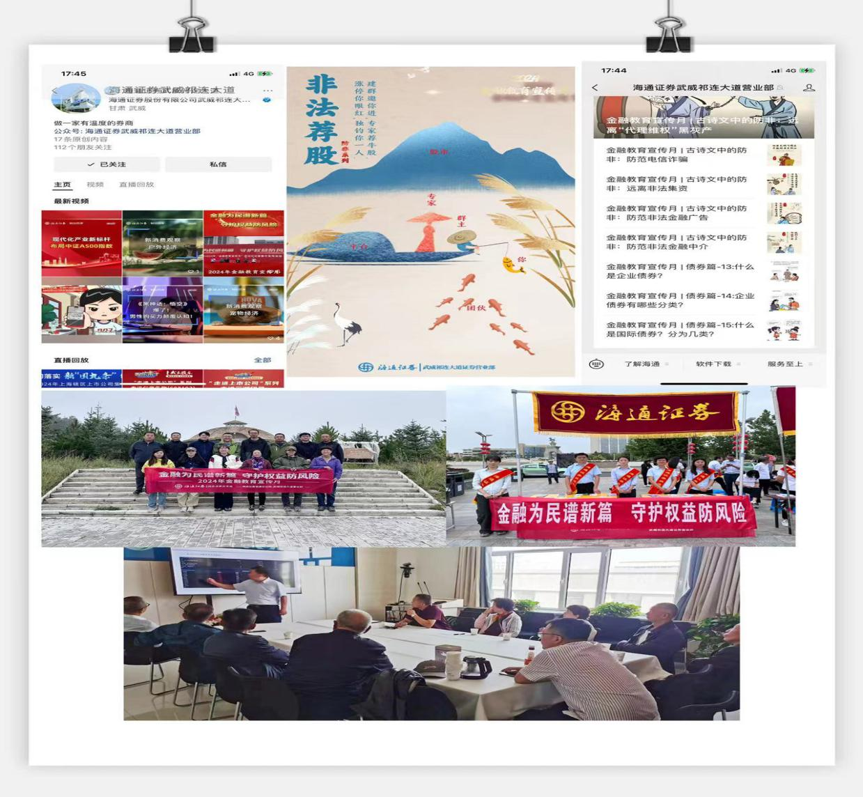 营业部精心制作了 “2024 年金融消费者权益保护宣传海报”投放在营业部微信公众号上,将上交所、北交所和海通证券投教基地制作的投教图文一并进行线上转播。同时,营业部通过视频号发布投教短视频,主播全景网的投教直播,充分利用网络平台的便捷性和广泛性,向广大金融消费者普及基础金融知识,提示金融风险。