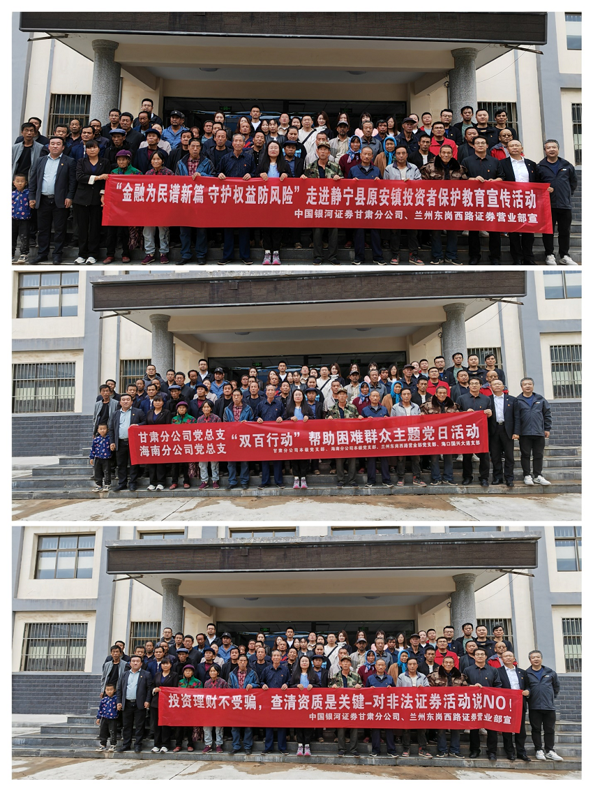 为做好投资者合法权益保护工作,中国银河证券兰州东岗西路营业部开展2024年金融教育宣传走进“静宁县原安镇”投资者教育活动。本次活动结合甘肃分公司党支部、兰州东岗西路营业部党支部的“双百行动”主题党日活动联合开展。此次活动以“金融为民谱新篇 守护权益防风险”为主题,重点围绕静宁县原安镇村民开展防范非法集资、非法证券活动,普及金融知识,提升村民风险防范意识,做好投资者合法权益保护工作。