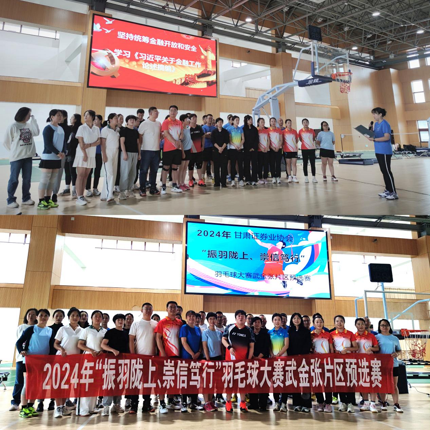 2024年9月21日,甘肃证券期货业协会2024年“振羽陇上,崇信笃行”羽毛球大赛武威、金昌、张掖片区预选赛在金昌市全民健身中心羽毛球场馆举办。参加此次预选赛的有海通证券武威祁连大道营业部、华龙证券武威凤凰路营业部、华安证券武威滨河路营业部,海通证券金昌长春路营业部、华龙证券金昌昆明路营业部、中信建投证券金昌建设路营业部,国泰君安张掖县府南街营业部,华龙证券张掖丹霞路营业部,华安证券张掖长寿街营业部共九支代表队。
