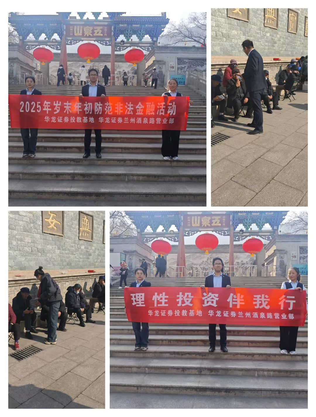 为贯彻落实党的二十届三中全会、中央金融工作会议精神和新“国九条”要求,深入践行以人民为中心价值取向,根据深交所及公司总部要求,2025年1月20日,华龙证券兰州酒泉路营业部在兰州市五泉山广场组织开展“理性投资伴我行”专项投教活动。