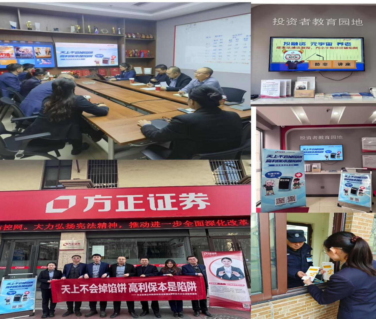 营业部全体员工通过方正证券投教基地公众号、视频号,在微信朋友圈、发送短信等渠道提示客户“两节”期间防范非法金融活动,宣传非法集资案例等。充分地向线上、线下客户提示非法集资提醒,非法集资手段、各项案例等。