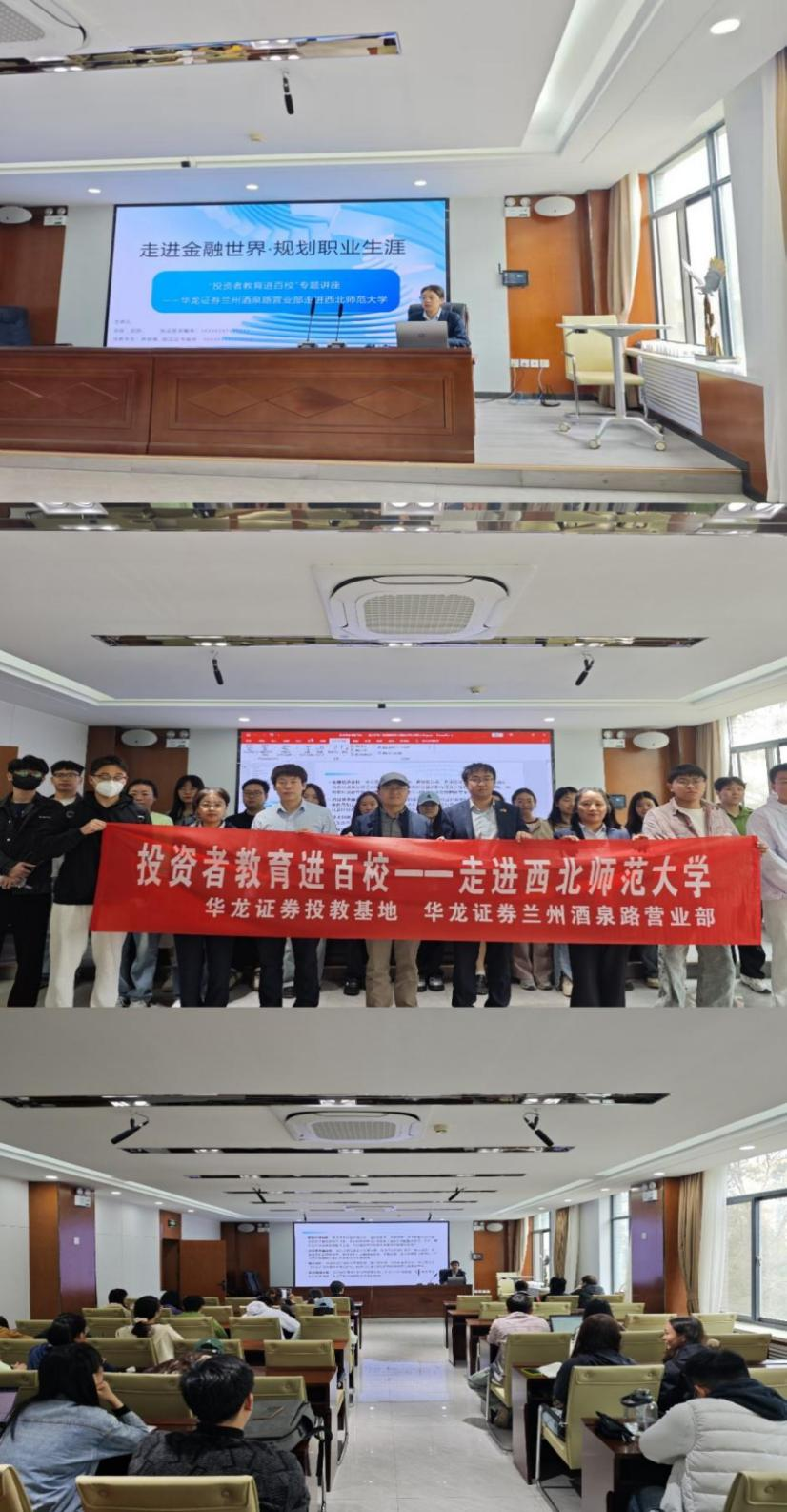 为积极响应中国证券业协会“投资者教育进百校”倡议,推动投资者教育纳入国民教育体系,2025年4月23日,华龙证券兰州酒泉路营业部联合西北师范大学组织开展“投资者教育进百校”专项投教活动。此次投教活动以讲座形式开展,旨在通过普及证券知识,提升在校学生金融素养,培养理性投资理念,增强风险防范意识,助力资本市场高质量发展。