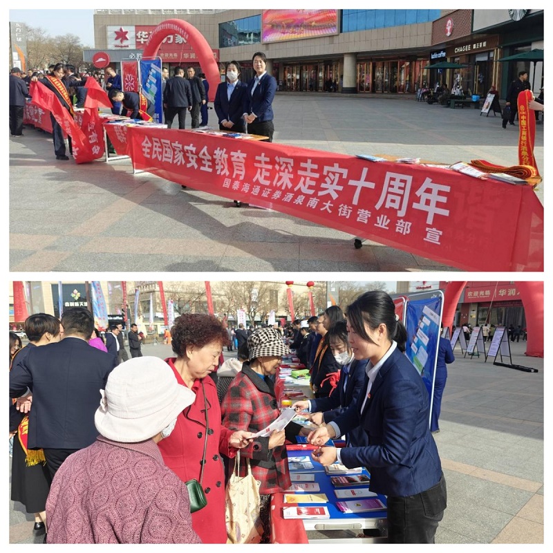 2025年4月15日是第十个全民国家安全教育日,是国家安全法颁布施行的10周年。为深入贯彻落实习近平总书记关于全面加强国家安全教育的重要指示批示精神,按照甘肃证监局工作指导和甘肃证券期货业协会的相关要求,国泰海通证券酒泉南大街营业部积极开展了2025年国家安全教育日普法宣传活动。