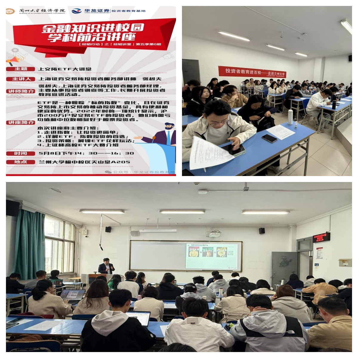 为贯彻中央金融工作会议精神及新“国九条”部署,落实证监会和教育部加强证券期货知识普及工作要求,切实推动将投资者教育纳入国民教育体系,华龙证券投资者教育基地联合上海证券交易所、华龙证券兰州七里河证券营业部以及兰州永昌路证券营业部于5月8日举办“投资者教育进百校——走进兰州大学”主题活动,活动以“高质量发展的上交所etf市场”为核心,融合上交所etf知识大讲堂、行业研究框架解析及风险案例研讨,吸引了兰州大学经济学院四十余名师生参与,此次活动旨在提高在校大学生的金融素养和投资意识,打造“零门槛、强互动、可实践”的高校etf投教模式,为大学生构建“认知-兴趣-行动”的金融素养成长闭环。